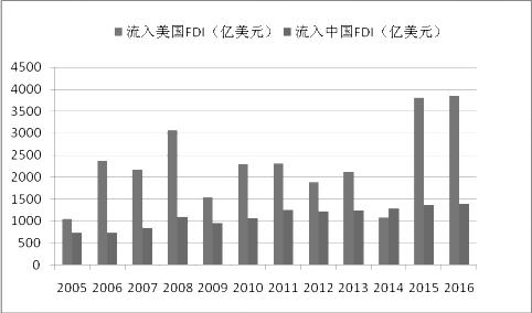 图1 2005-2016年流入中国和美国FDI规模对比