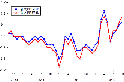 2、“三黑一色”产品价格大幅回升加速PPI降幅收窄。受国际大宗商品价格进入回升周期、去产能工作稳步推进和基础设施投资力度加大等因素综合影响,“三黑一色”产品价格大幅改善。在合成PPI的40个大类行业中,“三黑一色”产品价格的大幅回升对PPI恢复性上涨起到了支撑和驱动作用。采用钢铁、有色和石化行业PPI环比数据,发现三者合成的环比PPI走势与统计局公布的PPI总指数走势具有高度一致性,相关系数高达0.97(见图1)。